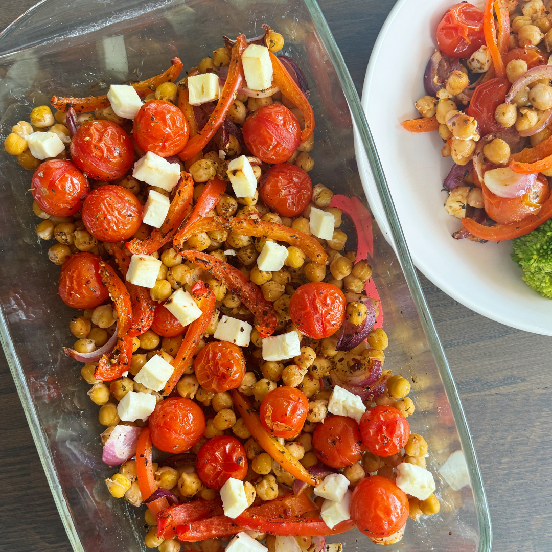 Roast for around 40-50 mins, until the chickpeas are crispy, tomatoes softened and feta soft. Stir half way through roasting.