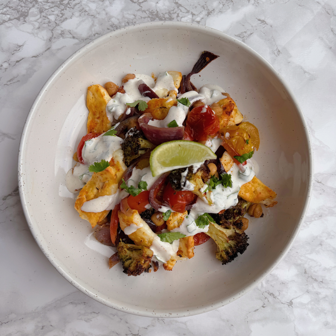To serve, plate up the traybake and salad leaves, then drizzle with the lime & coriander dressing.