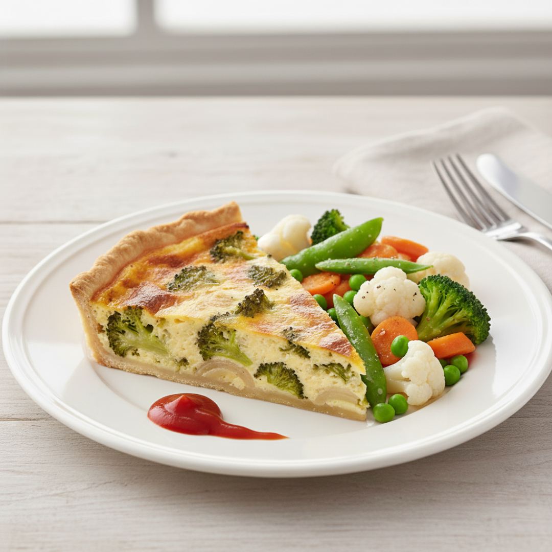 Serve the warmed quiche with the vegetables on the side and add ketchup or mayonnaise as a condiment.