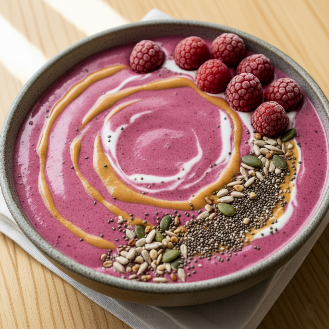 Pour into a bowl and top with the reserved berries, the remaining peanut butter and mixed seeds.