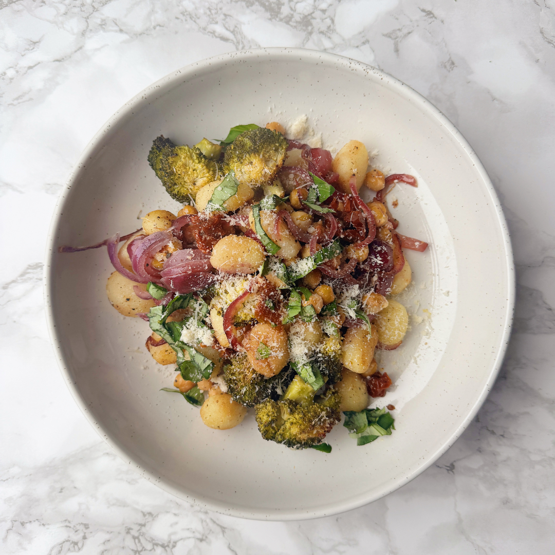 Place the gnocchi, chickpeas, sun-dried tomatoes, red onion and broccoli into a small ovenproof dish.